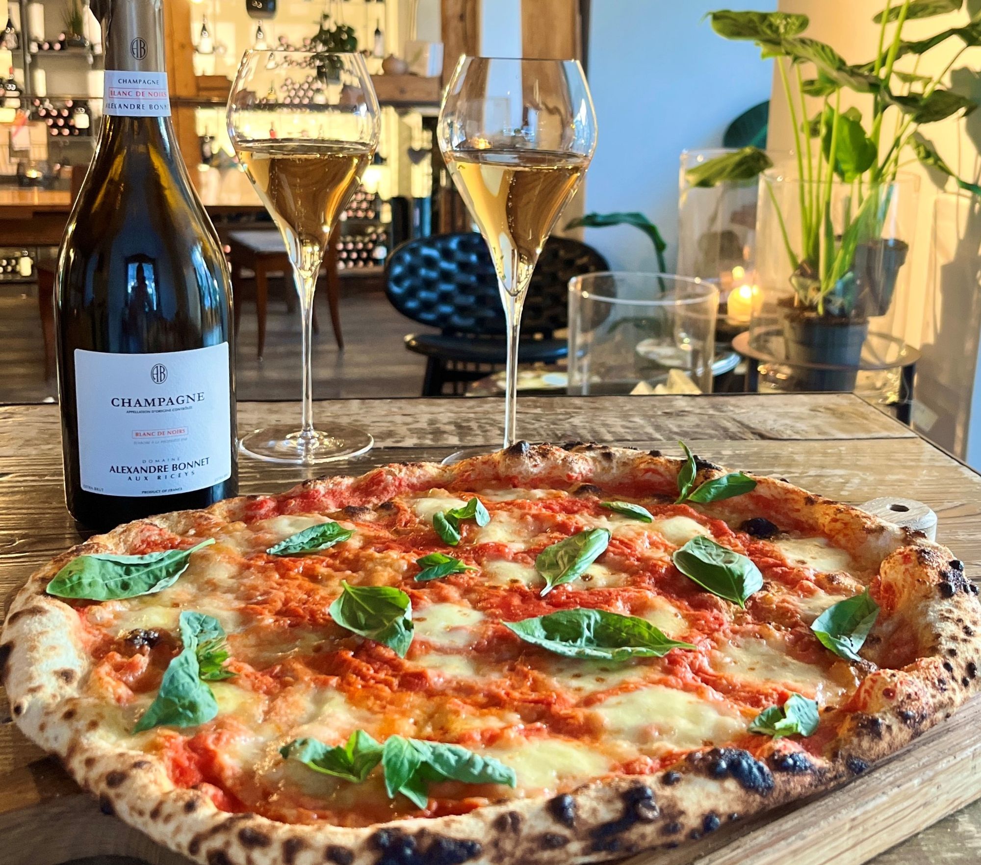 Eine Flasche Champagner (Alexandre Bonnet 0,7 l) und eine Pizza VERDE in unserer Vinothek.
