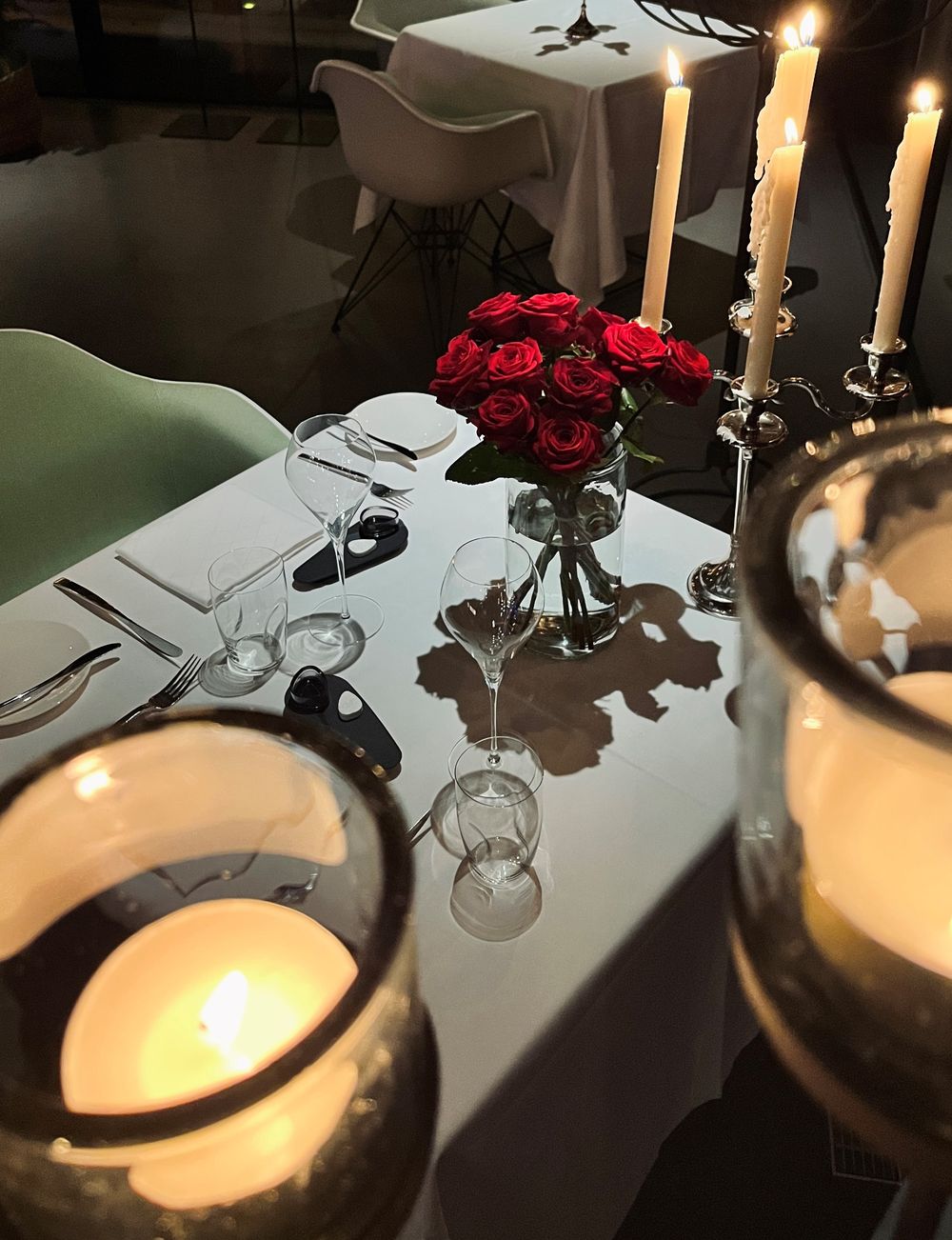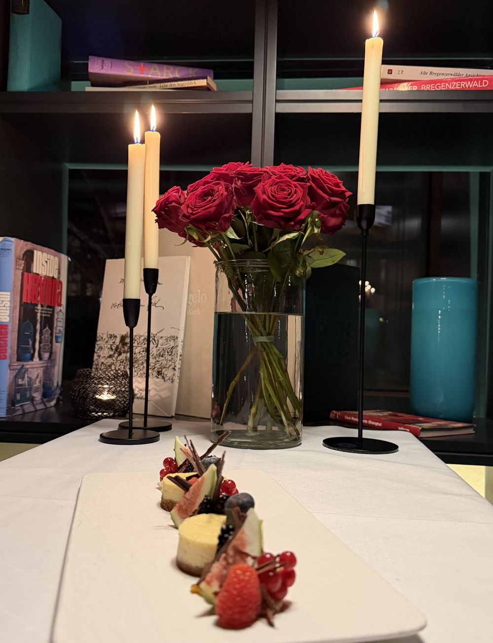 Gaumenstreichler und Zungenküsse, Kerzenschein und rote Rosen, verführerischer Wein zu den kulinarischen Kunststücken.