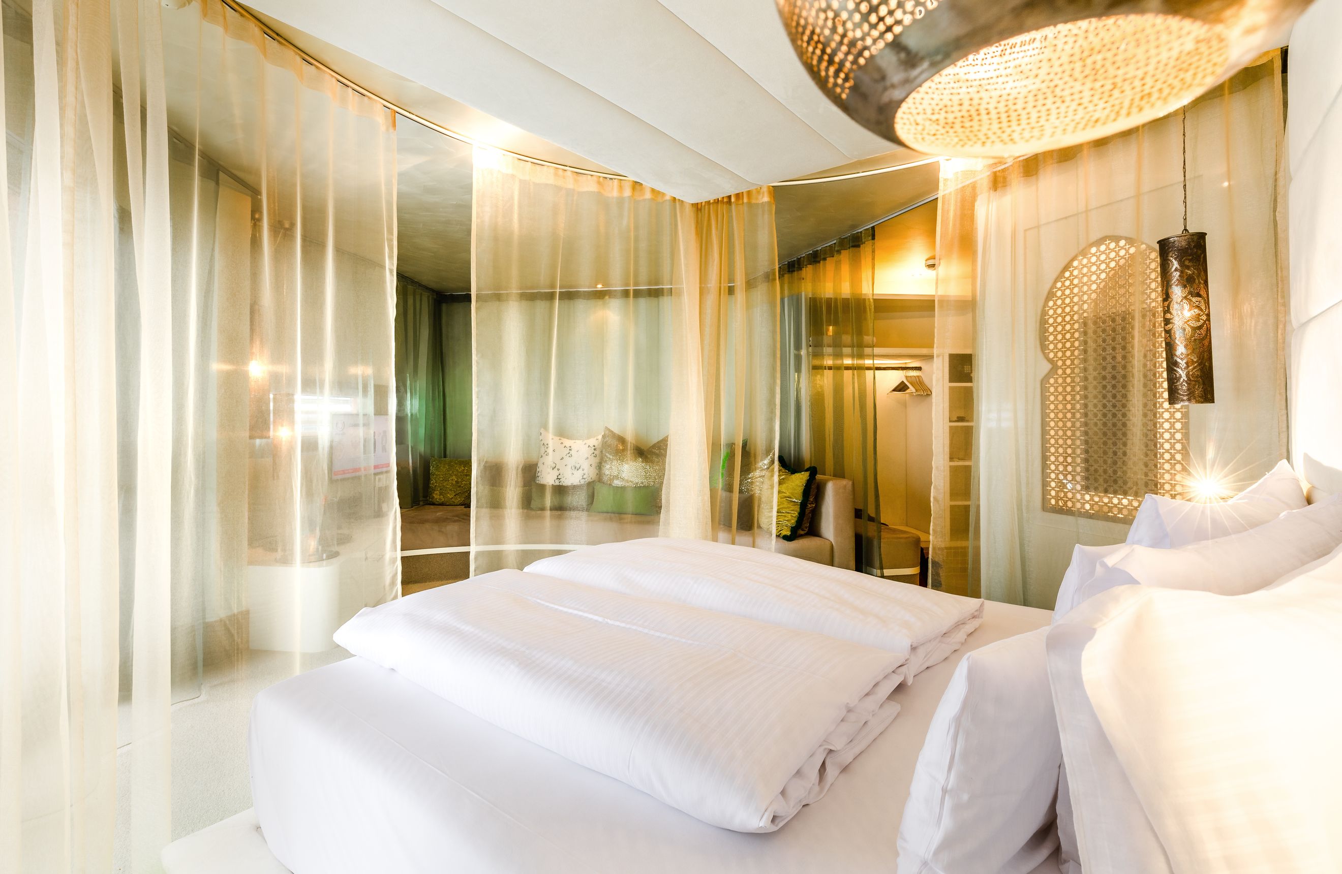Die Top of Suiten sind rund gestaltet und mit 65 m² deutlich größer als die Kuschelsuiten. Die um das breite Himmelbett gespannten Vorhänge lassen sich vielfältig verschieben, sodass jeder Gast seine ganz persönliche Kuschelecke gestalten kann. Das Highlight, die Top of Suite.